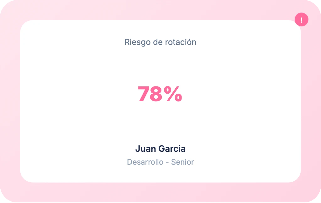 People Analytics detecta señales tempranas: cambios de comportamiento, bajada de engagement, patrones similares a empleados que ya se fueron de la compañía para que puedas adelantarte.