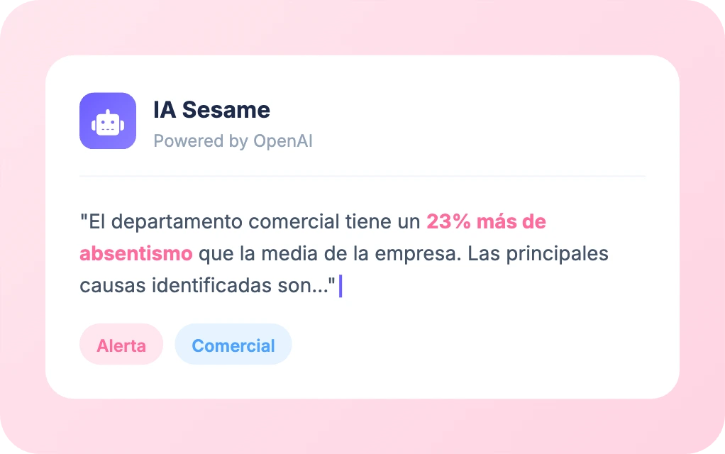 Sesame analiza automáticamente los datos de tu equipo (demografía, fichajes, contratos) usando tecnología OpenAI y genera insights en lenguaje natural. Por ejemplo: "El departamento comercial tiene un 23% más de absentismo que la media" o "Detectamos riesgo de rotación en el equipo de desarrollo".
